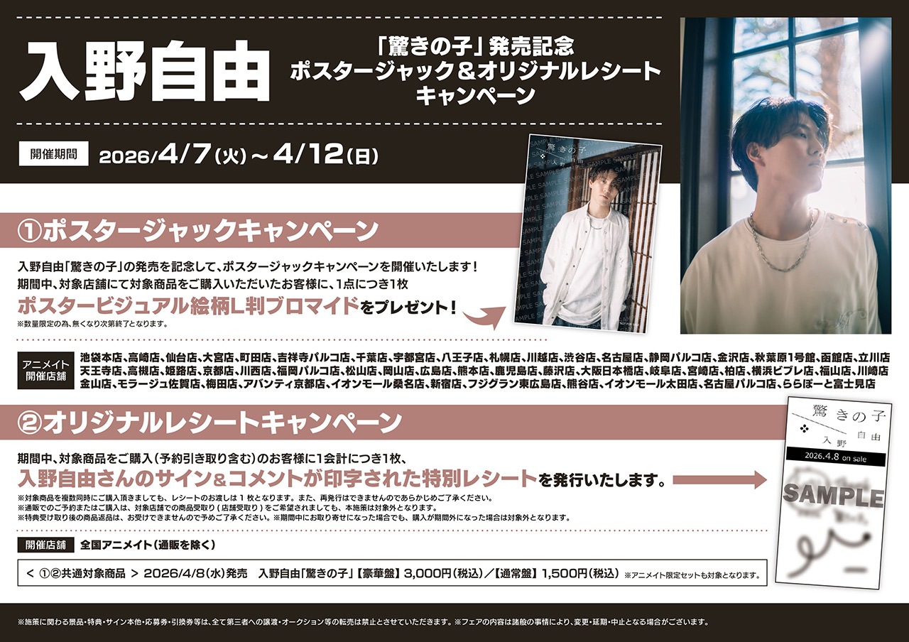 入野自由「驚きの子」の発売を記念して、アニメイトにてポスタージャックキャンペーン、オリジナルレシートキャンペーンを開催!