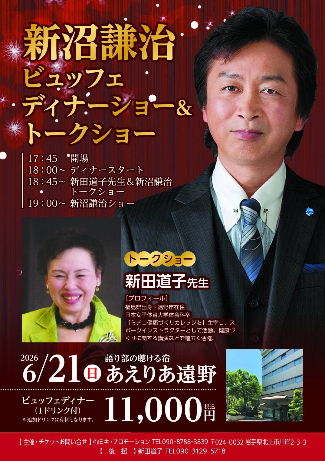 6/21(日)遠野にて「新沼謙治 ビュッフェ・ディナーショー&トークショー」を行います。