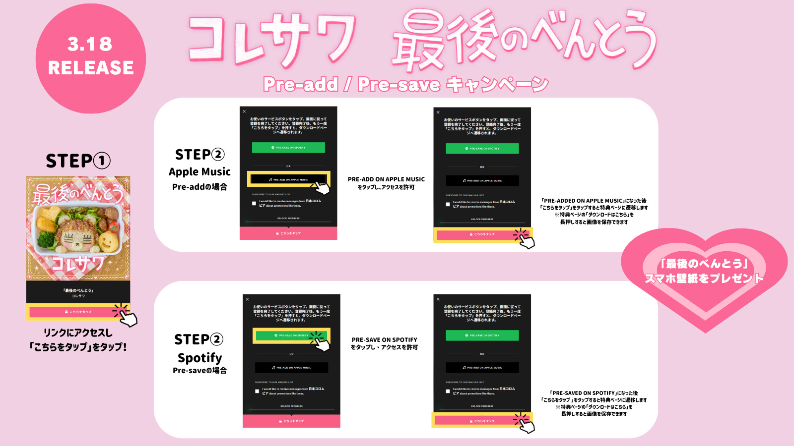 2026年3月18日(水)にリリースとなるコレサワNew Digital Single「最後のべんとう」を指定の期間内にApple MusicまたはSpotifyにて、Pre-add / Pre-saveしていただいた方