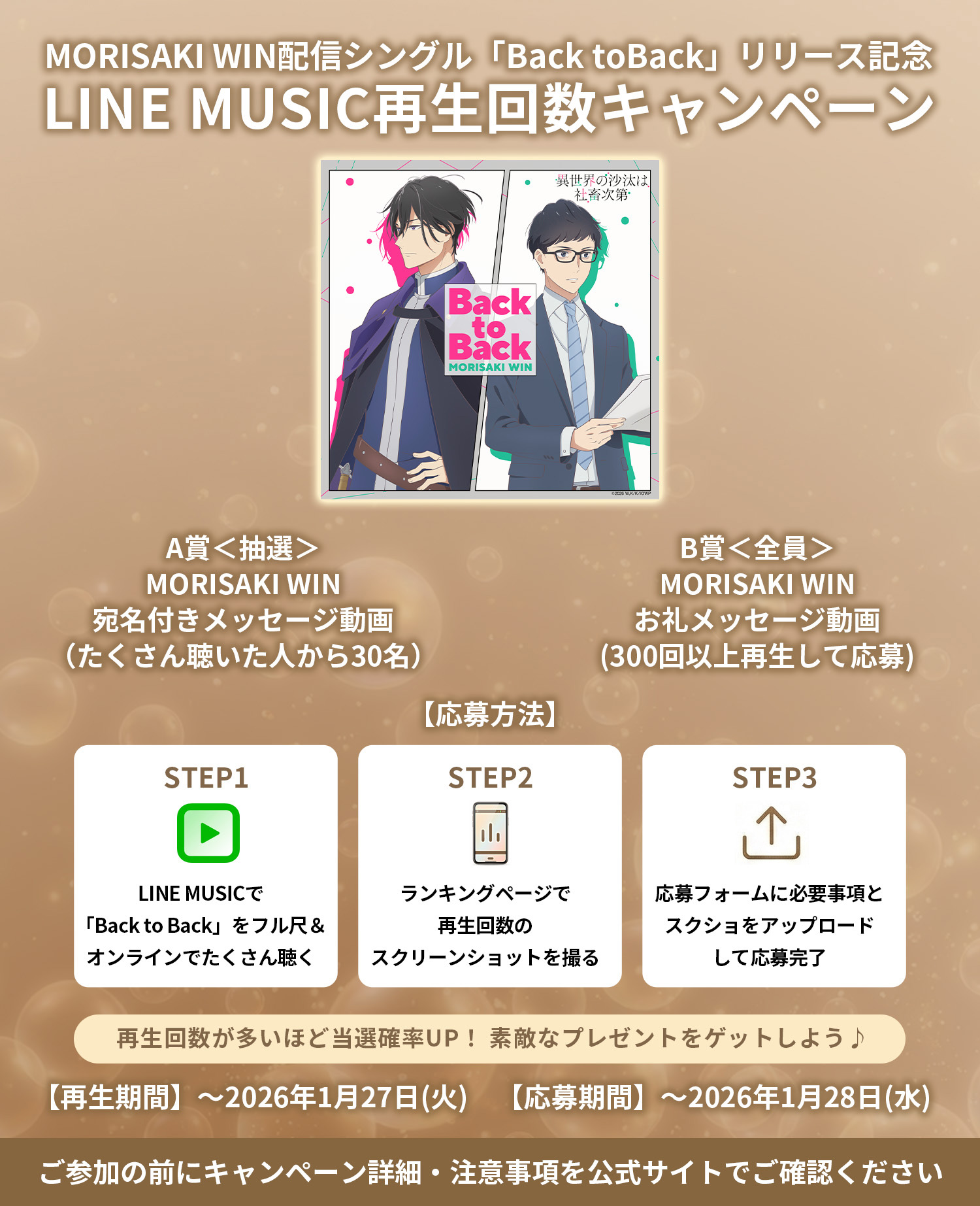 2026/1/7(水)より配信される「Back to Back」のリリースを記念して、LINE MUSICでの再生回数キャンペーンを実施!