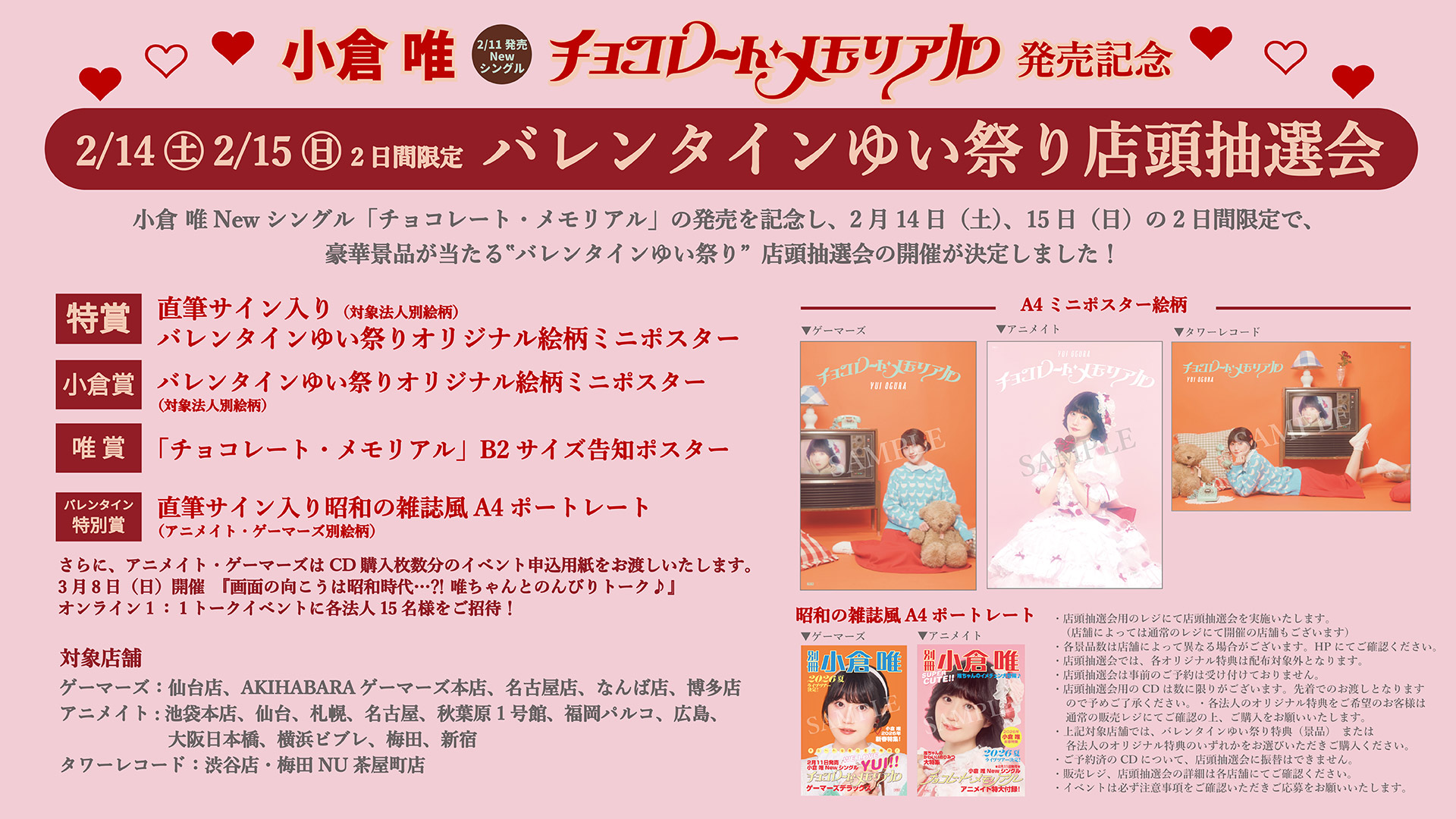 小倉 唯 Newシングル「チョコレート・メモリアル」を対象店舗にて新規でご購入頂きましたお客様は“バレンタインゆい祭り”店頭抽選会(はずれなし)にご参加頂けます。また、アニメイト・ゲーマーズの店頭抽選会の対象店舗にてご参加より抽選で各法人15名様が当たる「チョコレート・メモリアル」発売記念オンライン1:1トーク『画面の向こうは昭和時代…?! 唯ちゃんとのんびりトーク♪』の応募用紙をもれなく差し上げます。