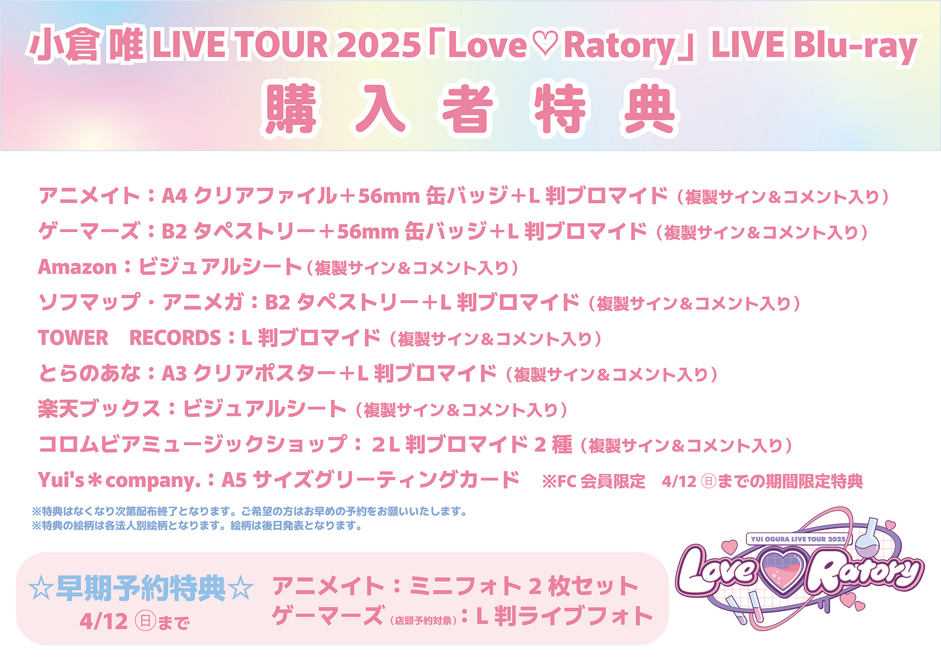 下記店舗にて、2026/5/27発売・小倉 唯 LIVE Blu-ray「小倉 唯 LIVE TOUR 2025「Love♡Ratory」LIVE Blu-ray」(COXC-7513)をご購入の方に先着で特典をプレゼントします!!