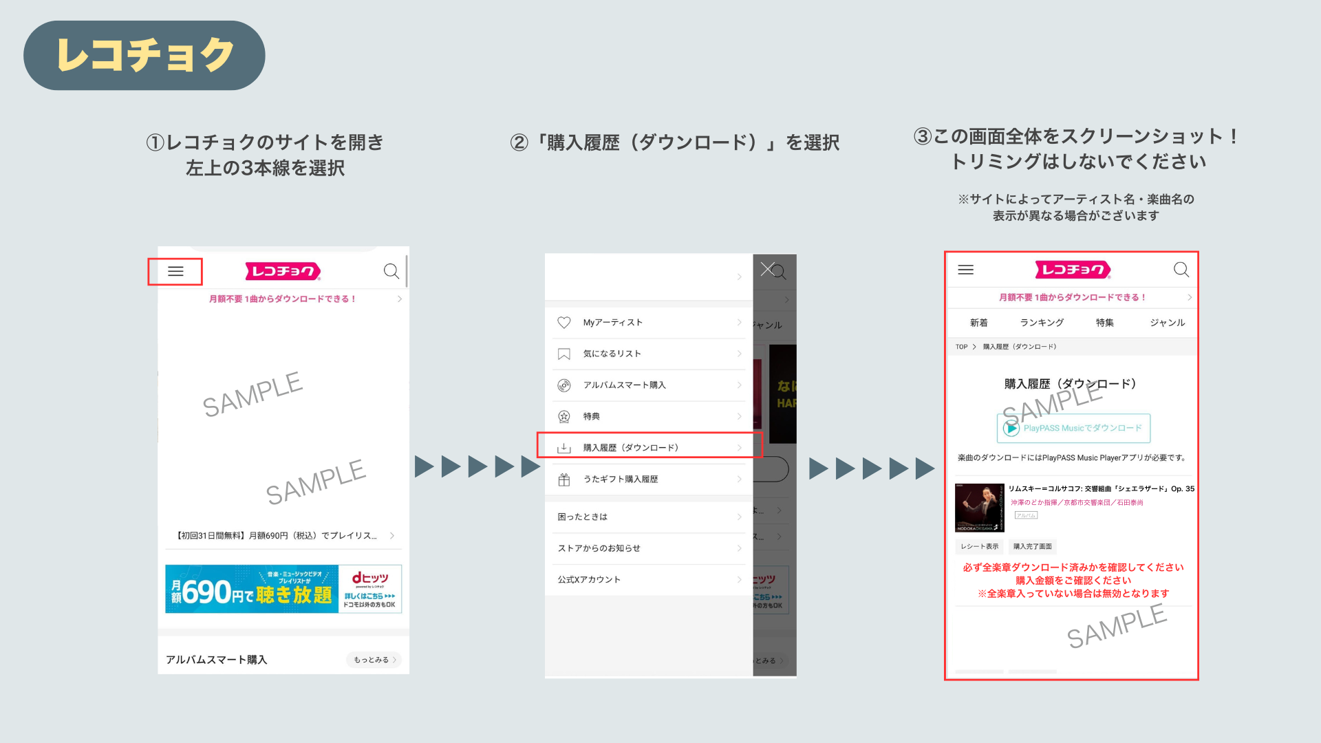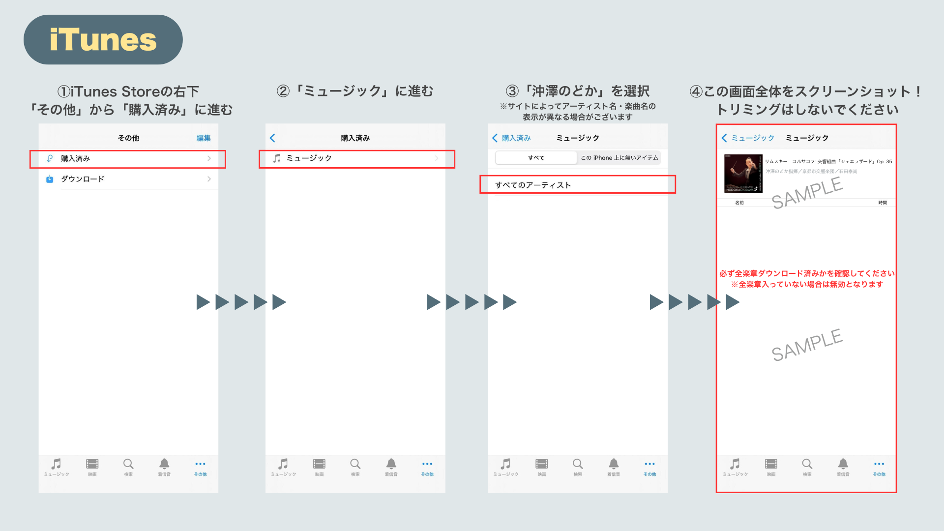 ※サブスクリプションサービスの再生画面(Apple Music等)ではなく『iTunes等のダウンロード購入履歴』がわかる画面を添付してください