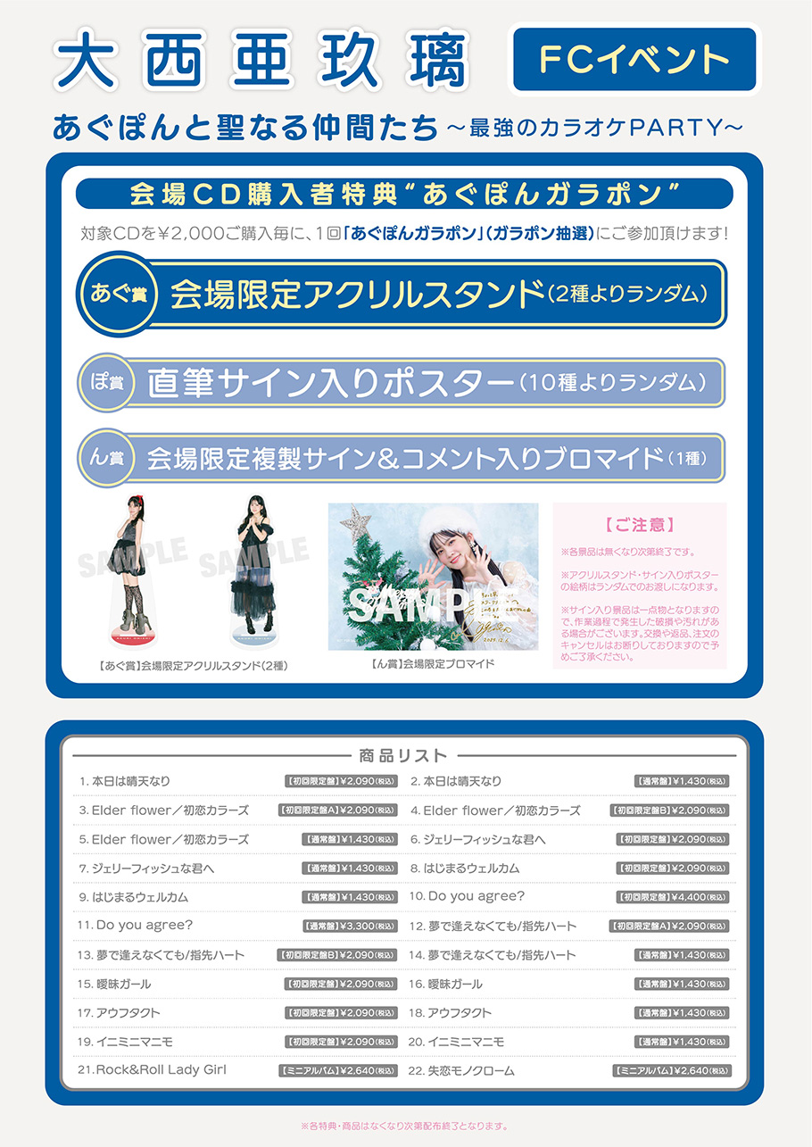 2025/12/6(土)に飛行船シアターにて開催する「大西亜玖璃FCイベント あぐぽんと聖なる仲間たち〜最強のカラオケPARTY〜」にてCDの会場販売を行います。会場CD購入者特典の実施も決定! ぜひチェックしてください!!