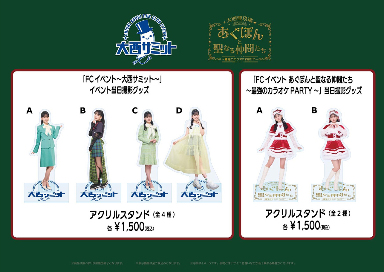 2025/12/6(土)に飛行船シアターにて開催した「大西亜玖璃FCイベント あぐぽんと聖なる仲間たち〜最強のカラオケPARTY〜」グッズの事後通販、そして、3/1(土)に開催された「大西亜玖璃FCイベント〜大西サミット〜」、「大西亜玖璃FCイベント あぐぽんと聖なる仲間たち〜最強のカラオケPARTY〜」当日撮影新グッズの通販が決定しました。