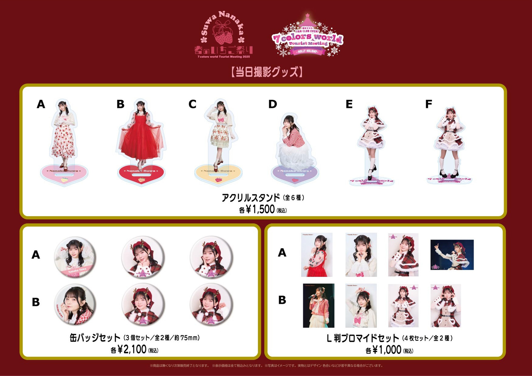 2025/12/14(日)に神田明神ホールにて開催されました「諏訪ななか 7colors world Tourist Meeting〜Holly Holiday〜」グッズの事後通販、そして、3/9に開催されました「諏訪ななか7colors world Tourist Meeting2025〜春のいちご祭り〜」、そして「諏訪ななか7colors world Tourist Meeting〜Holly Holiday〜」当日撮影新グッズの通販が決定しました。