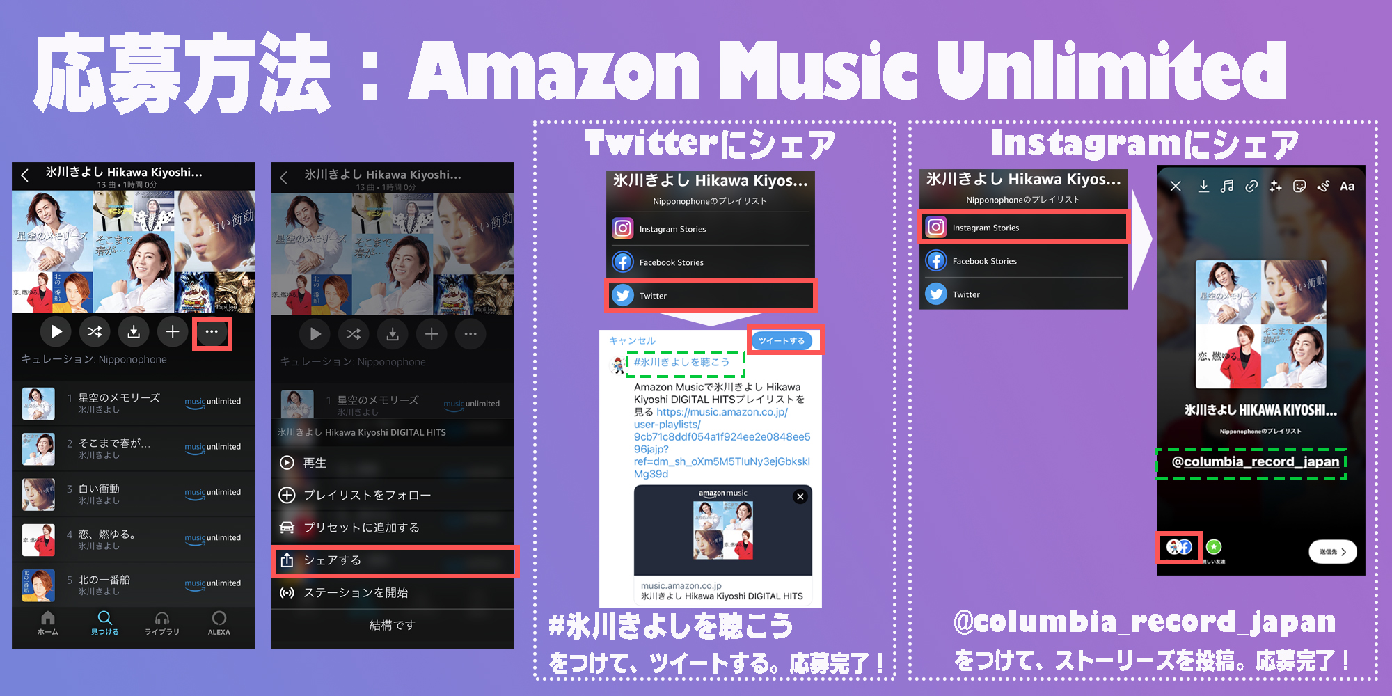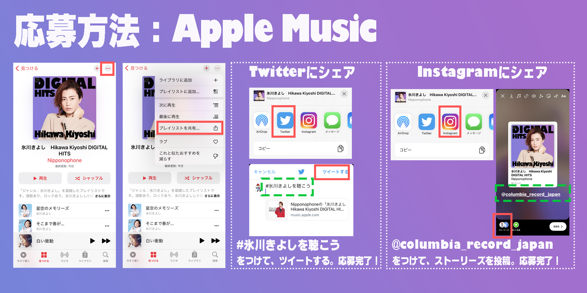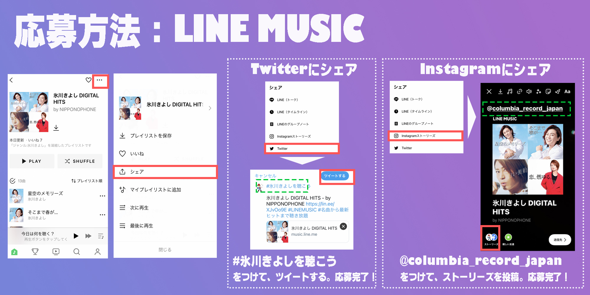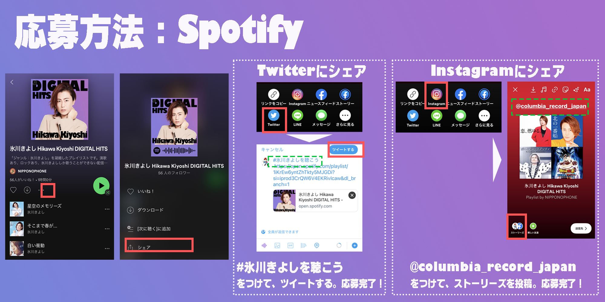 Instagramストーリーズにプレイリスが表示されたら、メンション@columbia_record_japanをつけてシェア投稿。