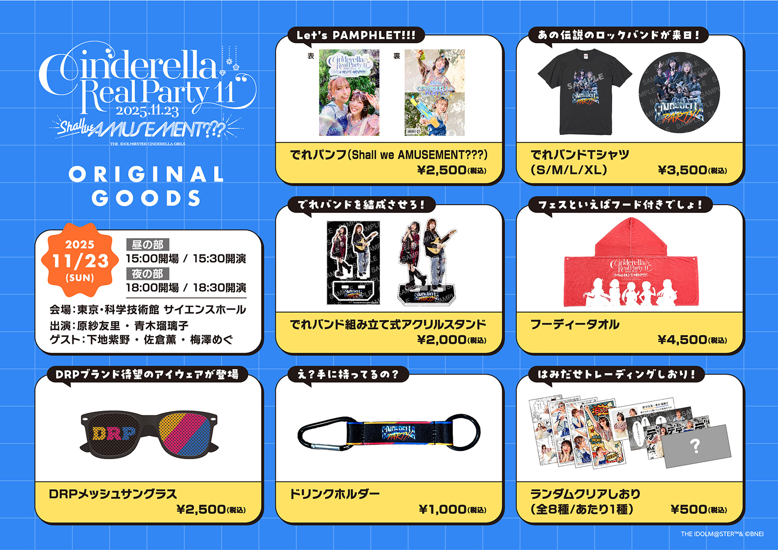 「フェス」をテーマにした今回の公録イベントならではのグッズがラインナップ!主宰の原紗友里(本田未央役)さん、青木瑠璃子(多田李衣菜役)さん、 ゲストの下地紫野(中野有香役)さん、佐倉薫(黒埼ちとせ役)さん、梅澤めぐ(辻野あかり役)さんの撮り下ろし写真や主宰インタビューなどを掲載したパンフレット、 ロックなバンドTシャツやアクリルスタンド、また今年発売した書籍「はみだしシンデレラパーティー」での使用もおすすめのしおりなど、 詳しくは販売ページをご確認ください!