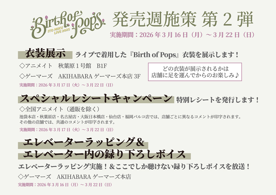 伊藤美来 LIVE Blu-ray「ITO MIKU Live Tour 2025『Birth of Pops』」の発売を記念して、AKIHABARAゲーマーズ本店にてエレベーターラッピングを実施します!! さらに、エレベーター内ではここでしか聴けない録り下ろしボイスを放送! ご来店の際はぜひチェックしてください。