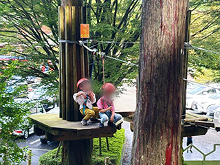 樹齢300年クラスの大木が点在する森の中に設けられているのは、日本最大級のジップトリップコース。こちらは小学1年生以上、身長110cm以上、体重110kg以下という制限が設けられていたので、パパたち&小3チームが挑戦しました。ビルの3階ほどの高さはありそうなジップラインは、長いもので100mを超えていて、木々の間を急スピードで滑っていくためスリル満点。大人も子どもも大盛り上がりで、森の中を本当に飛んでいるような非日常体験ができたようです。