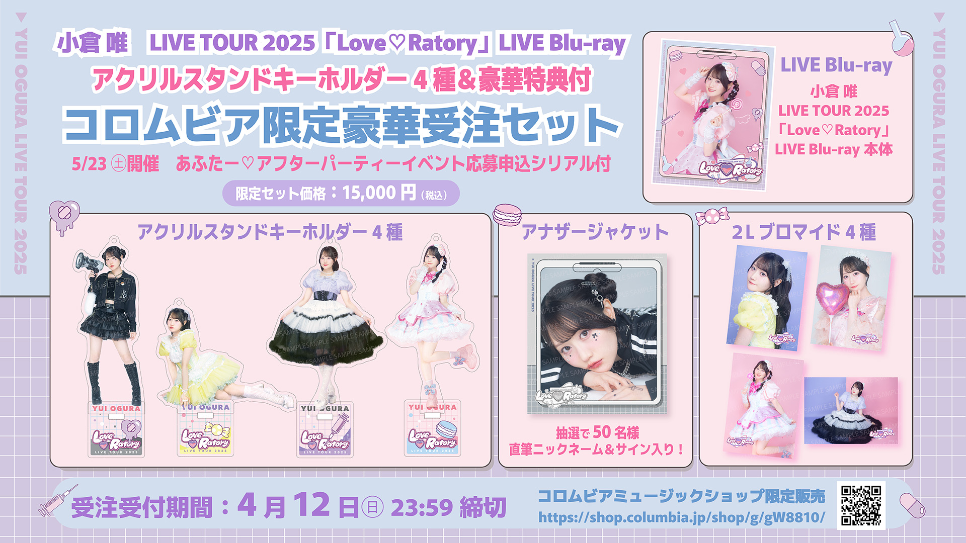 コロムビアミュージックショップ限定セット「小倉 唯 LIVE TOUR 2025「Love♡Ratory」LIVE Blu-ray」アクリルスタンドキーホルダー4種付き豪華受注限定セットの発売が決定!!