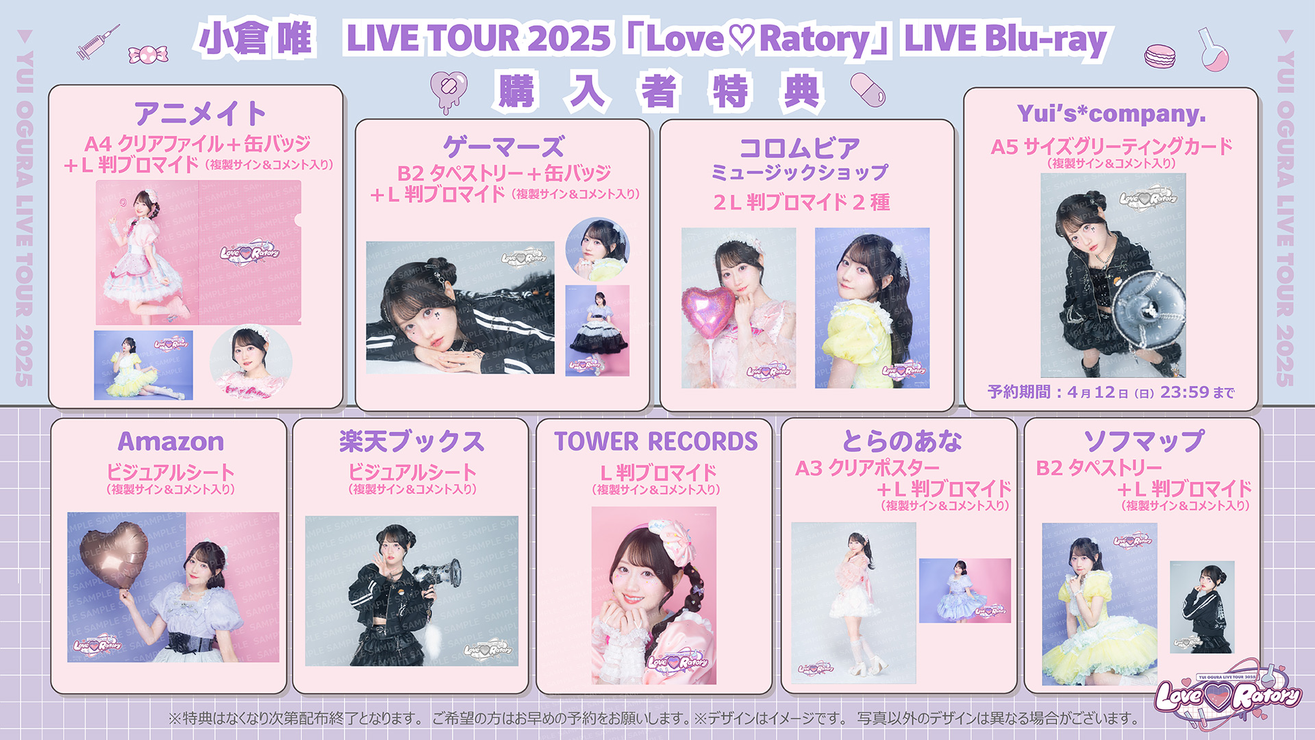 下記期間でゲーマーズにて小倉 唯 LIVE TOUR 2025「Love♡Ratory」LIVE Blu-rayをご予約頂きましたお客様に早期予約特典として、ライブフォトブロマイド(L判)をプレゼントします。