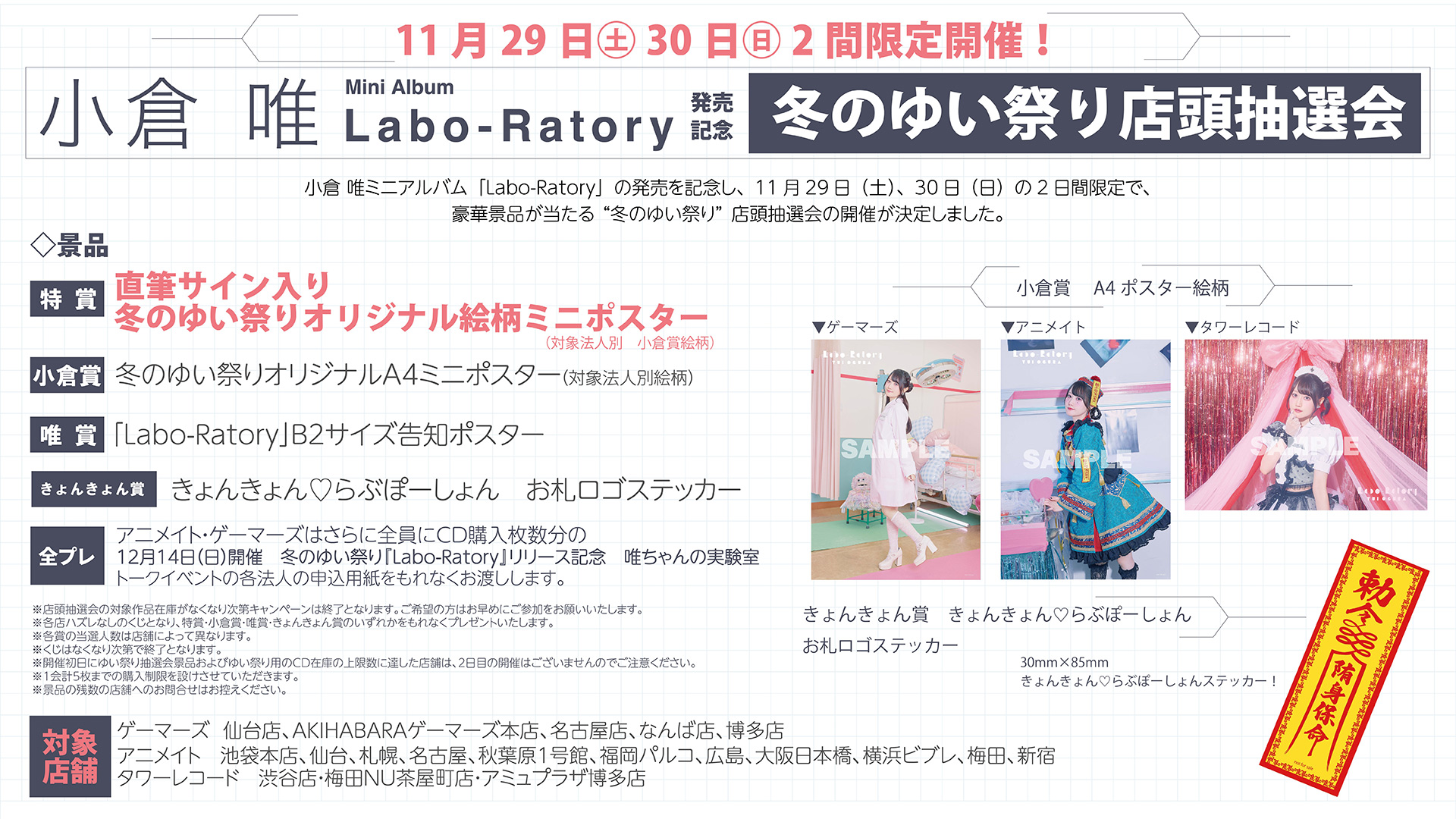 小倉 唯ミニアルバム『Labo-Ratory』を対象店舗にて新規でご購入頂きましたお客様は“冬のゆい祭り“店頭抽選会(はずれなし)にご参加頂けます。また、アニメイト・ゲーマーズの店頭抽選会の対象店舗にてご参加の方にはCD1枚につき1枚『Labo-Ratory』発売記念イベントの各対象店舗の申込用紙をもれなく差し上げます。
