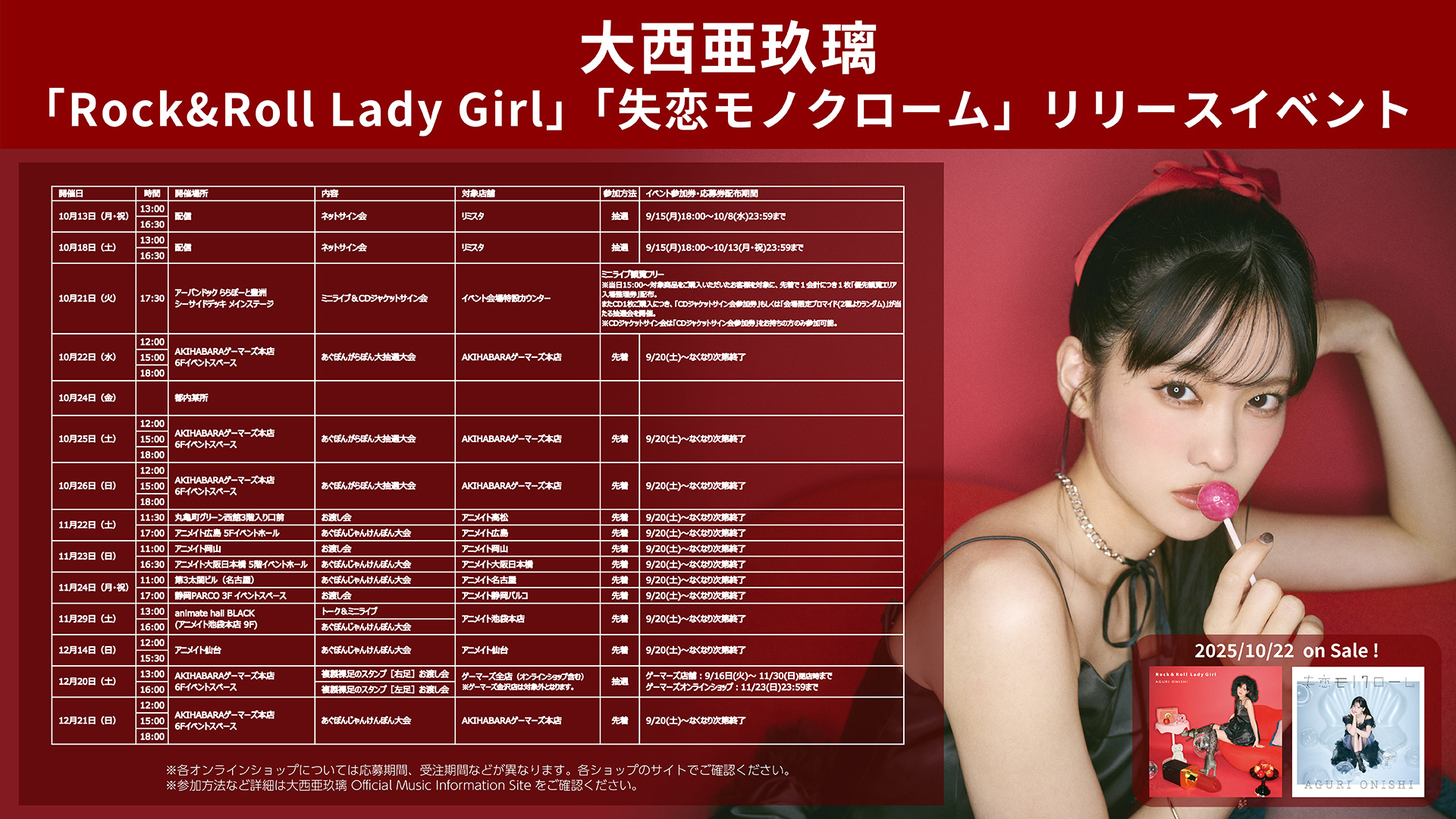 大西亜玖璃 コンセプトミニアルバム『Rock&Roll Lady Girl』『失恋モノクローム』の発売を記念して、リリースイベント開催が決定! 参加方法など詳細をご確認のうえ、奮ってご参加ください!!