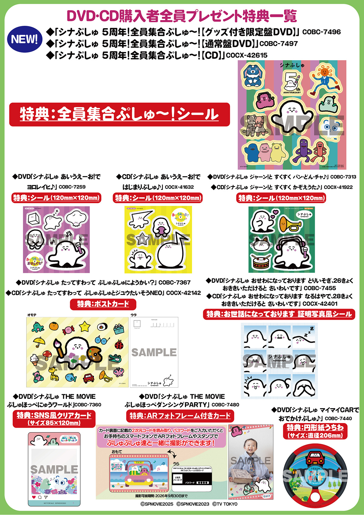 ※全員プレゼントの特典は、各DVD・CD発売時に「シナぷしゅ応援店」で購入者に付与された特典と同一のものになります。