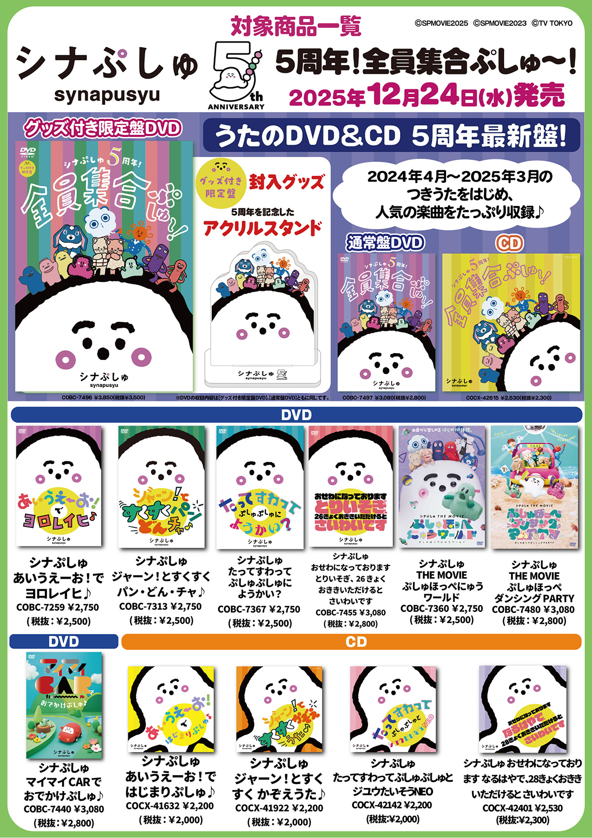 テレビ東京系列で放送中の民放初の赤ちゃん向け番組「シナぷしゅ」(毎週月曜~金曜 あさ7:30~7:57)は、2025年春にレギュラー放送開始5周年を迎えました。この記念すべきアニバーサリーイヤーを祝し、番組で生まれた大人気のうたを収録した最新のDVD『シナぷしゅ 5周年!全員集合ぷしゅ~!』が発売!